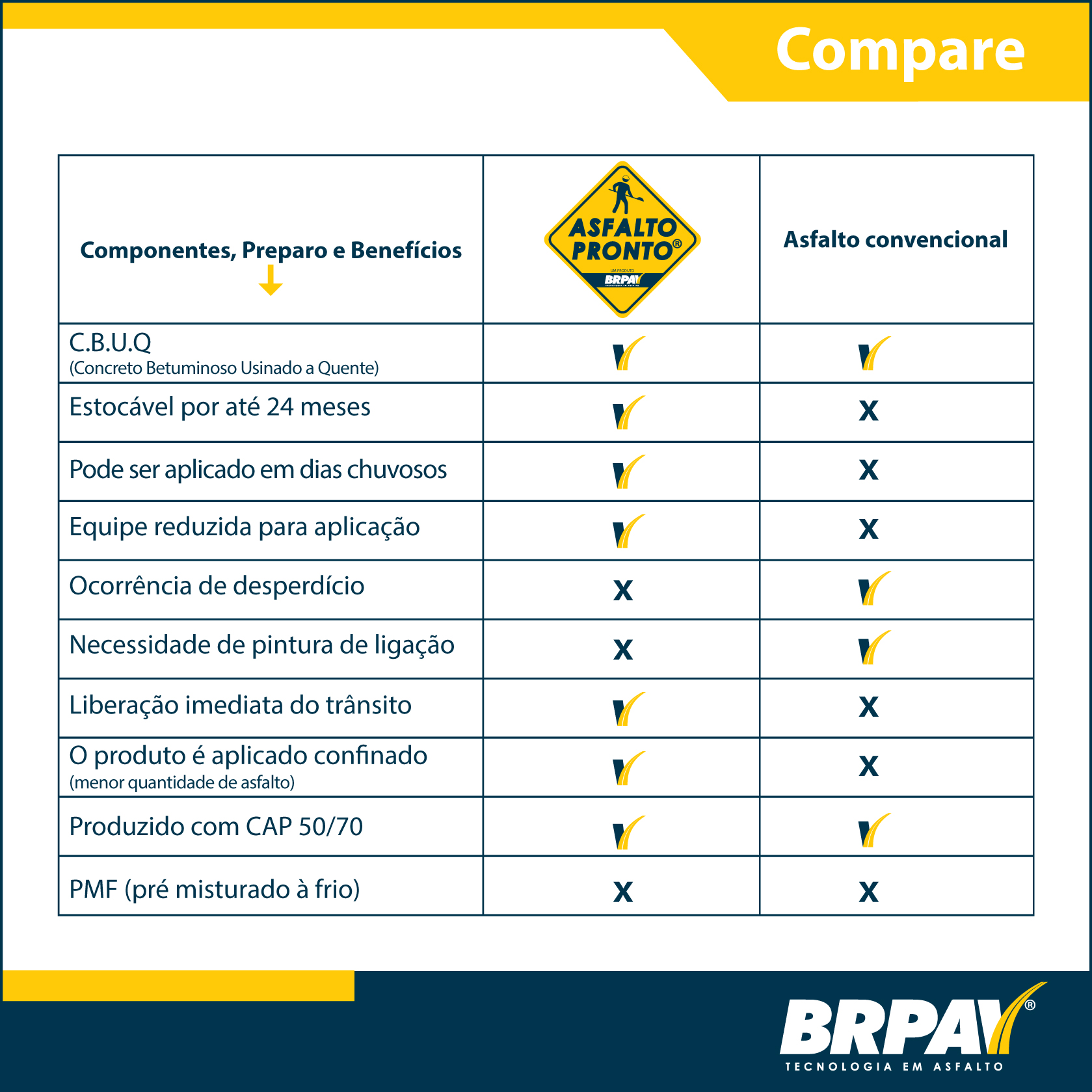 Veja a comparação entre o Asfalto Pronto® e o asfalto convencional. |
